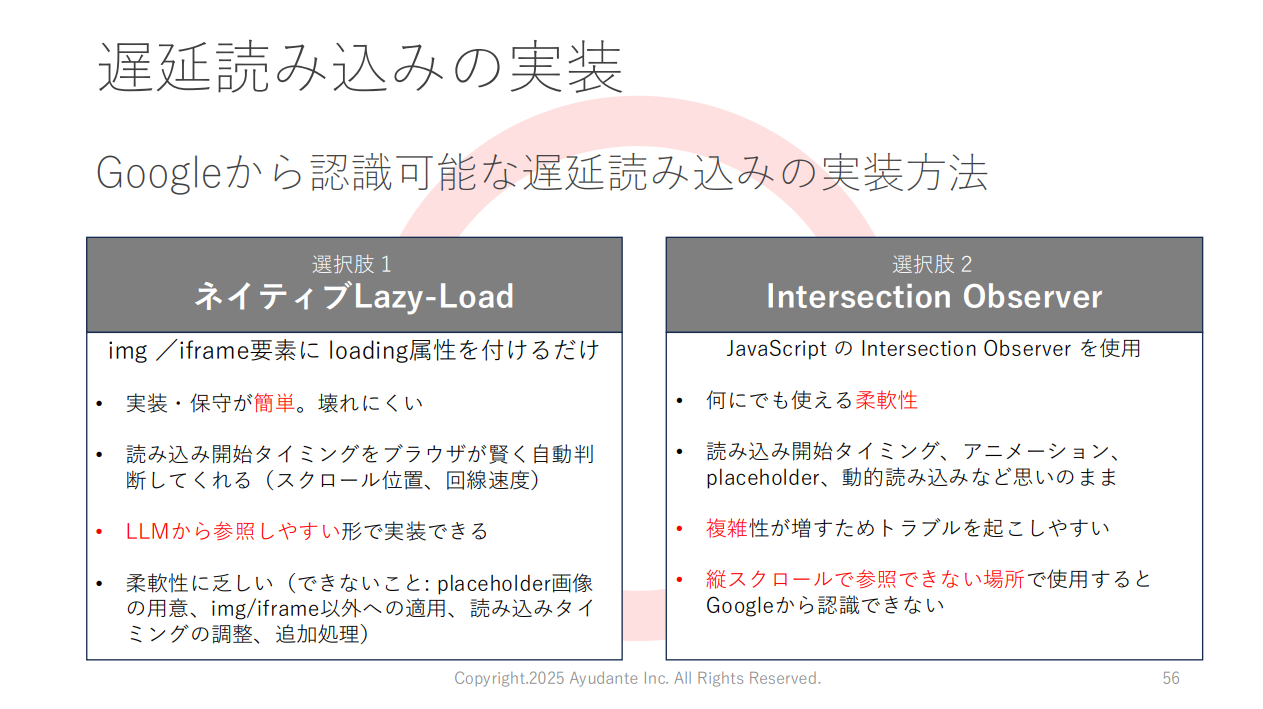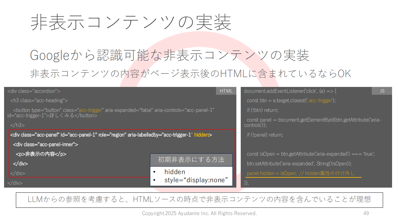 - ・開催いただきありがとうございました!非表示コンテンツがどう扱われるか曖昧な認識になっていたので、知ることができよかったです。遅延読み込みもlazyload以外のやり方を知らなかったので学びになりました。SEOでできることはなるべくやり切りつつ、LLM対策も視野に入れながら制作していこうと思いました!