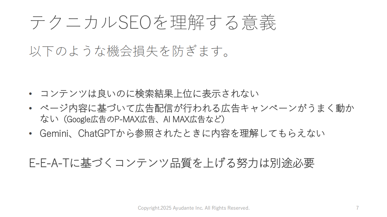 また、近年はLLMO(LLM対策)が注目を集めていますが、まずは検索エンジンに適切に理解されるサイト構築が不可欠です。Googleですら十分に理解できないページを、他のAIツールが理解することは困難な状況が多いからです。ChatGPTのようなAIの普及が進む今こそ、テクニカルSEOを改めて精査する価値が非常に高いものと考えております。