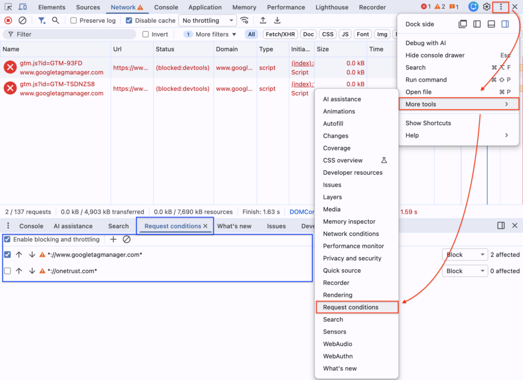 ブロックする通信の設定は右上の「︙」メニューから More tools(その他のツール) -> Request conditions(旧 : Network request blocking) を選択することで下部メニューに「Request conditions」タブを表示して確認・変更が可能です。