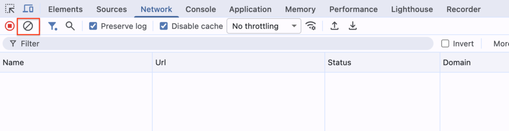 Networkパネルに出力された通信ログはデフォルトの状態だとページ更新・移動したときにすべてクリアされるので、リンククリックやリダイレクトのようなページを跨ぐアクション時に発生する通信を見たいときは「Preserve log(ログを保持)」にチェックを入れた状態で確認作業を行います。