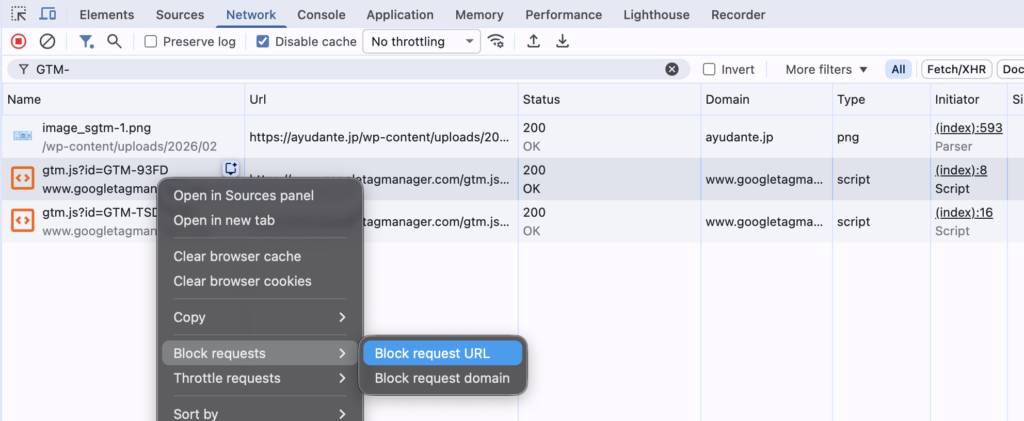 特定の計測タグの動作によりサイトに問題が発生している可能性がある場合、Chrome DevToolsで通信をブロックしてサイトに与えていた影響を簡易調査することができます。たとえばGTM(Google Tag Manager)の通信をブロックした状態でページを開くことで、サイト上で発生している問題にGTM内のタグ設定が関係している可能性を調査できます。