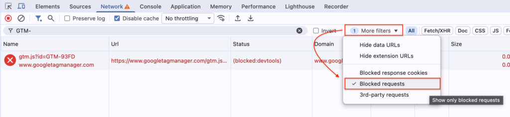 More filters (その他のフィルタ)メニューの Blocked Request(ブロックされたリクエスト)にチェックを入れることでブロックされた通信だけを表示フィルタリングできます。