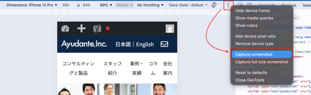 - デバイスエミュレート画面からスクリーンショットの撮影・保存ができます。
