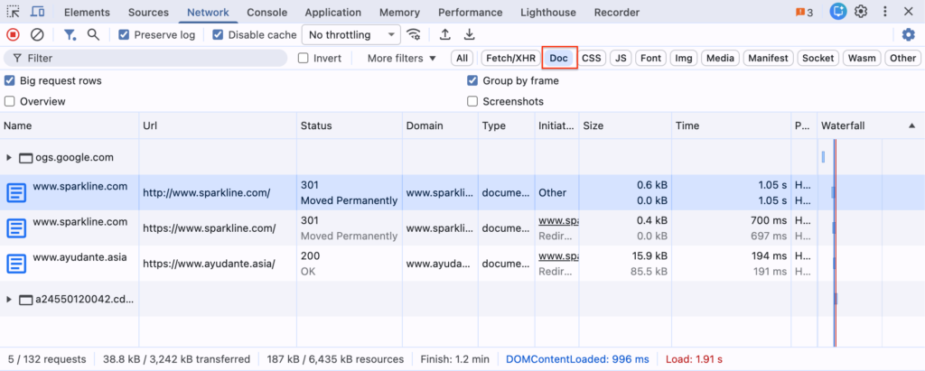 この状態で表示する通信ログを Doc (ドキュメント)に絞り込み、 http://www.sparkline.com を開くと、次の流れでリダイレクトしたことが分かります。