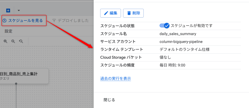 パイプライン内のクエリやノートブックなどを編集した場合は、必ず「デプロイ」ボタンを押して変更内容を反映させてください。デプロイを行わないと、スケジュール実行時に古いバージョンが使われてしまうため注意が必要です。