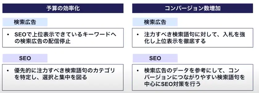 このように、本来同じ検索結果ですから、SEOと検索広告は両者を分析して、全体で対策をしていくべきです。広告だけでなく、SEOも投資のメリハリがつきます。全体として予算の抑制につながります。また、全体のコンバージョンを増やしていくことができますので、効率的でバランスの取れた検索エンジン対策ができます。