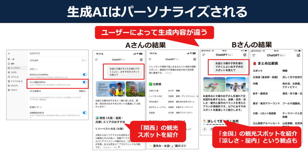 例えばChatGPTで同じ質問をしても、ユーザーによって返ってくる回答は違います。
