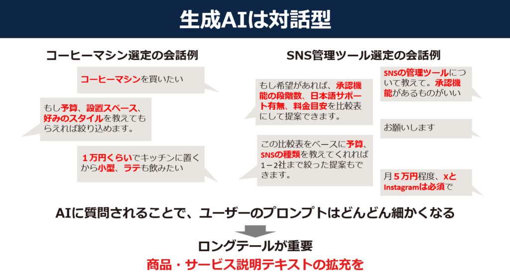 また、以下のように会話型のチャットでラリーをする中で、元々はユーザーが言葉にしていなかった詳細な条件を、言語化・顕在化していきやすくなるでしょう。実際、検索エンジンにおいても長いキーワードでの検索がどんどん増えているそうです(出典:Financial Times)。