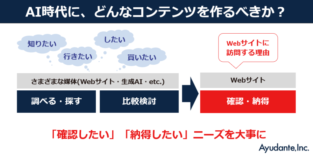 AIが普及していくこれからの時代において、「ユーザーがWebサイトに求めるもの」「Webサイトが価値を提供できること」について突き詰めて考えてみると、「確認」や「納得」に繋がるコンテンツを作り込んでいくことがより大事になってくるように思います。