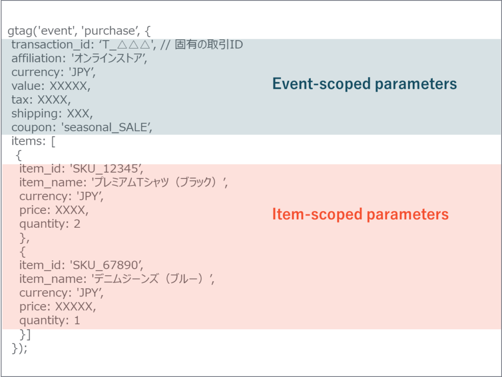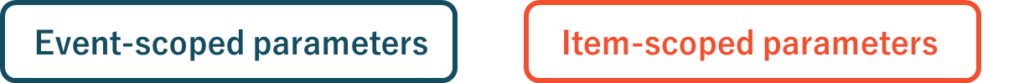 このように、購入(purchase)イベントには、トランザクションIDや購入金額、商品名や商品の価格など、様々な購入情報がパラメータとして付与されますが、各情報は、2つのスコープに区分されています。