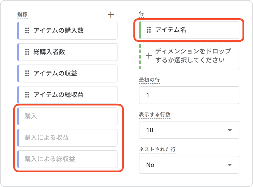 探索レポートでは、ディメンション設定箇所に「アイテム名」などのアイテムスコープのディメンションをセットすると、「購入」指標などのイベントスコープの指標がグレーアウトされます。