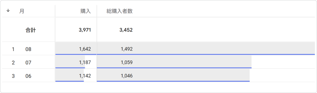 どれくらい購入アクションが発生したか?といった、ユーザーの購入回数が知りたい場合は、購入(purchase)イベントの数をカウントしている「購入」指標を使用します。