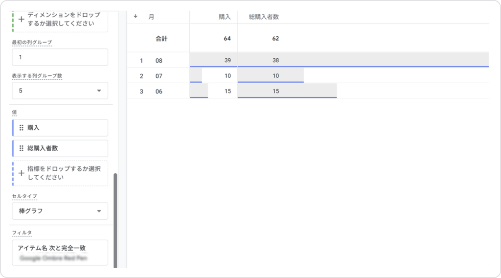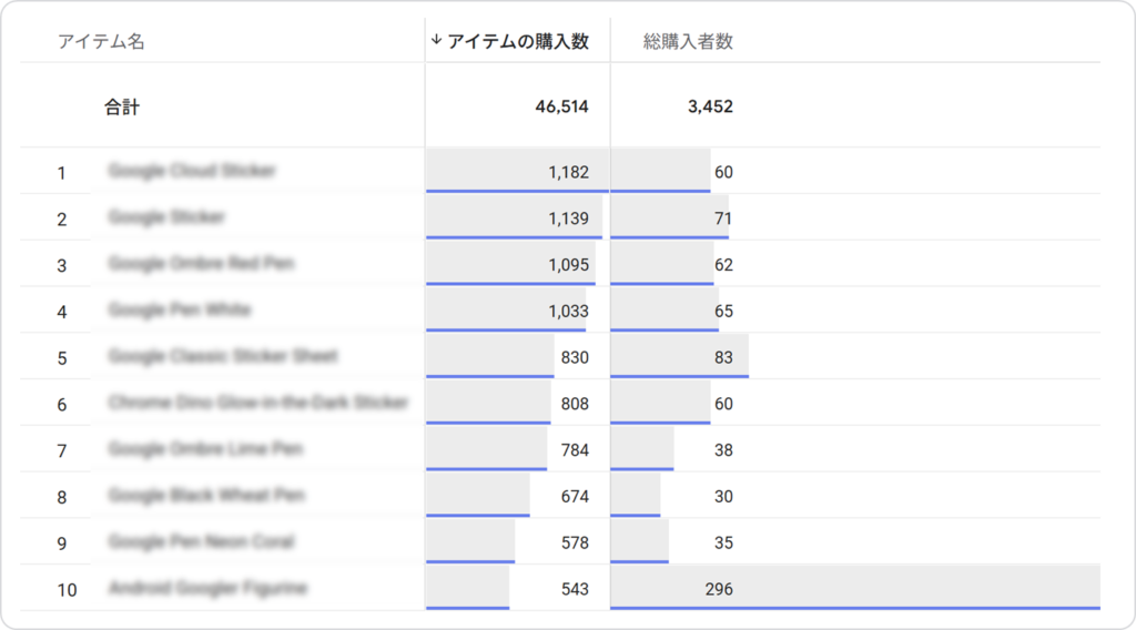 アイテム毎の購入数を知りたい場合は、アイテム数をカウントしている「アイテムの購入数」指標を使用します。