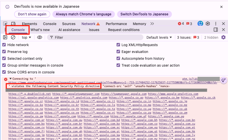 タグの通信もCSPによる制限を受けるため、タグごとに動作に必要な通信先を許可リストに追加しておかないと通信がブロックされてしまいます。