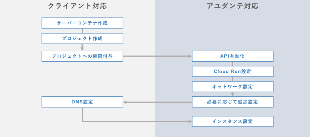 Google Cloud の場合、下図のようにプロジェクトの立ち上げから行います。弊社が支援する場合でも、クラウドやネットワーク、モニタリングなどの各種設定が必要となります。