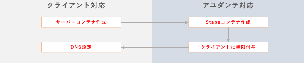 一方、Stape を利用する場合、クライアントにご依頼するのは「サーバーコンテナの作成」と「DNSの設定」のみです。