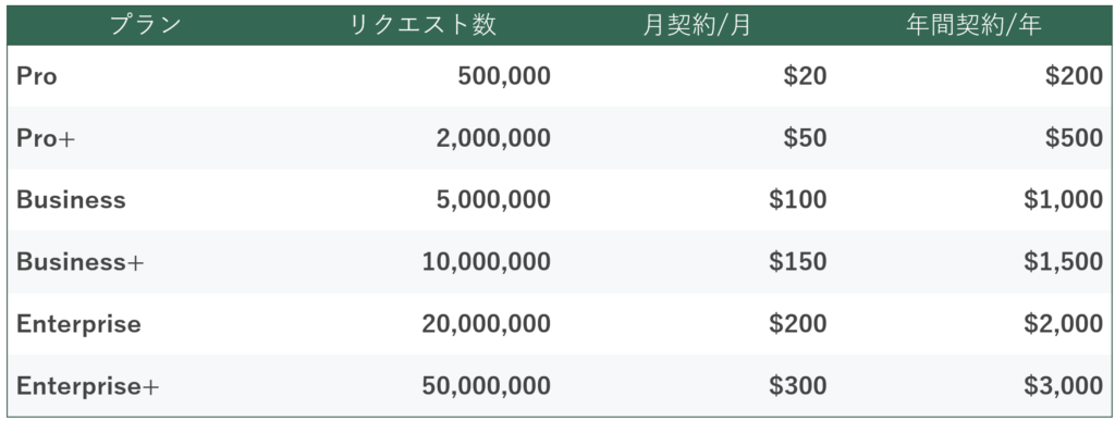 リクエスト数に応じたプラン表は以下の通りです。詳細は公式の料金表もご確認ください。