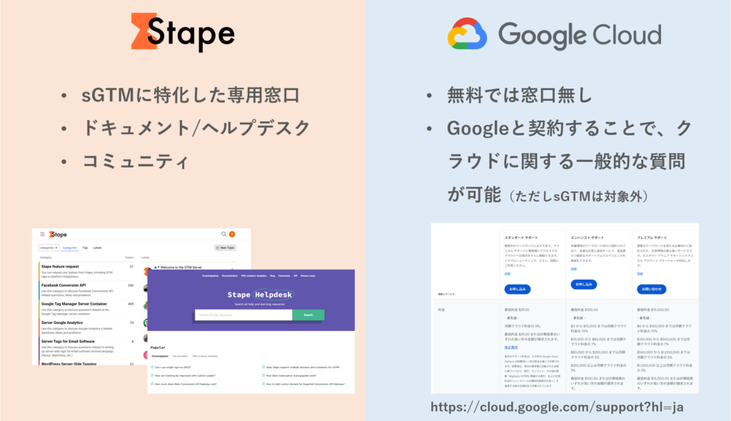 一方 Stape では、プラットフォームに関する質問はもちろん、sGTM に関する質問も問い合わせ窓口で相談可能です。
