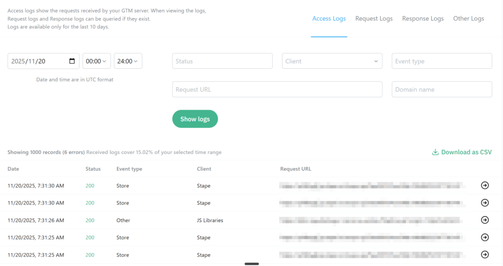 Stapeの場合、ログの蓄積に追加費用は発生しません。Stape の管理画面からシンプルな UI でログを確認できるのも利点です。(プランに応じてログの保持期間は異なります)