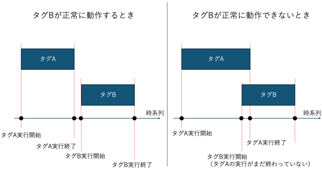ページを表示する環境(通信速度や端末の処理能力など)によって、タグの発火タイミングがわずかに前後したり、各タグの処理時間が伸び縮みしたりすることで、本来後続で動くはずのタグBが失敗してしまう可能性があります。