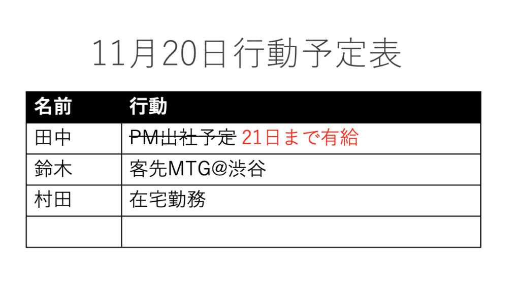同僚は上書き後のホワイトボードだけを見て、田中太郎さんと一緒に参加するはずだった重要な予定をキャンセルしてしまいます。