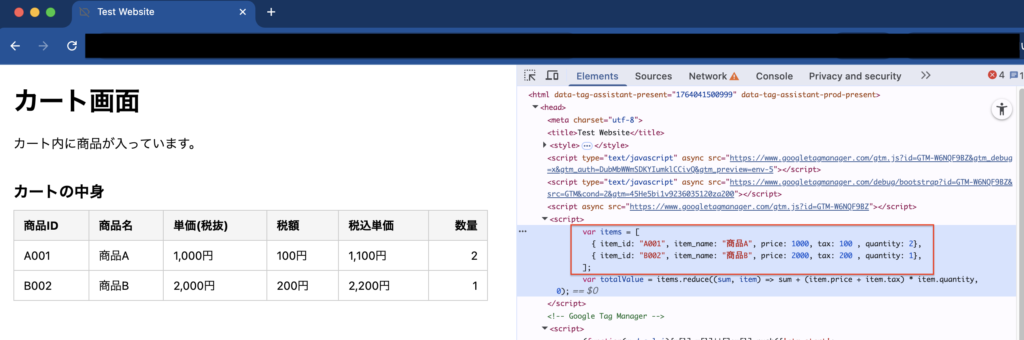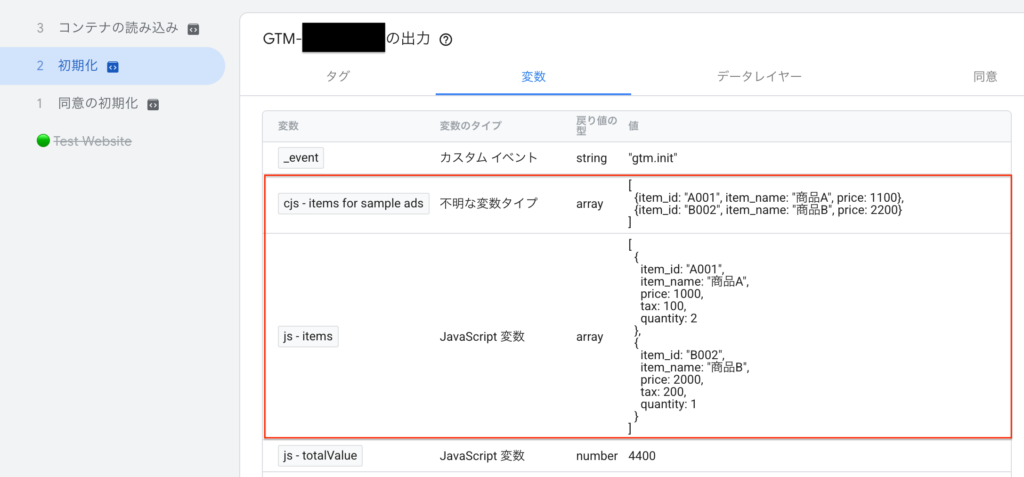 実行結果: カスタムJavaScript変数設定「cjs – items for sample ads」内の処理によってグローバル変数itemsの値が上書きされたため、itemsの値をそのまま参照しているJavaScript変数設定「js – items」にも影響が及んだ(税込金額への変換・taxプロパティの削除)