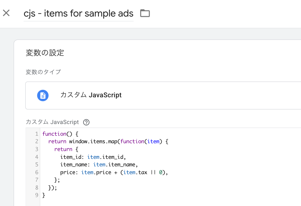 このitemsのpriceの値にtaxの値を足し合わせて税込み金額とした情報を、あるタグ設定に渡したいとします。その際、次のようなカスタムJavaScript変数を使うと元のitemsの値が上書きされてしまい、itemsの情報を利用しているすべてのタグ設定に影響が及ぶ危険性があります。