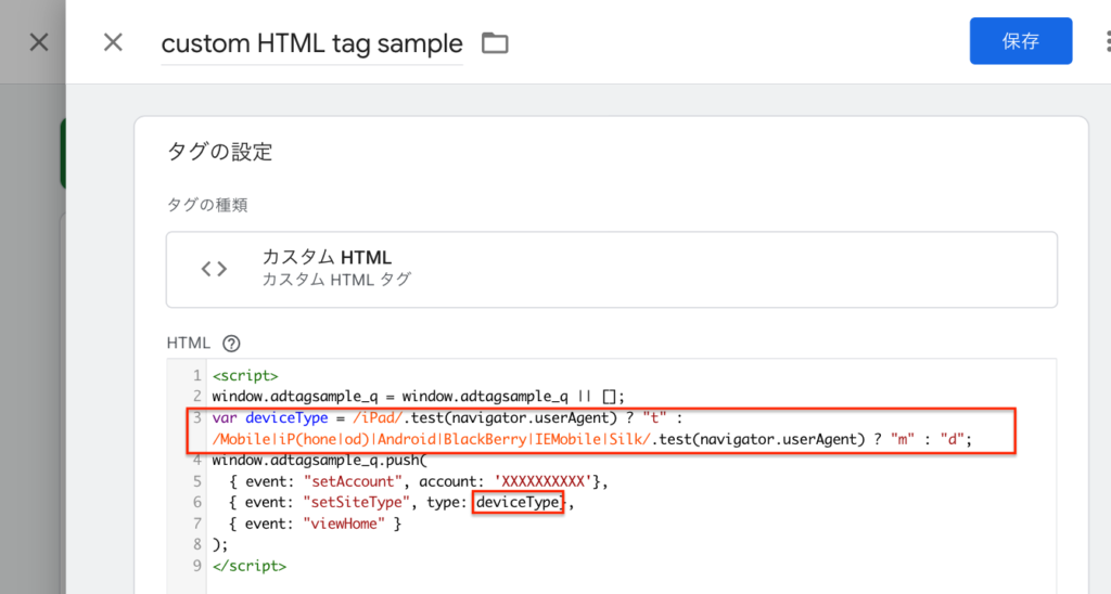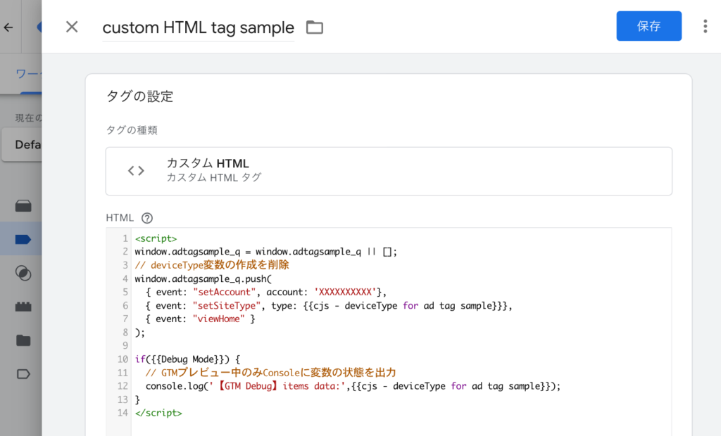 改善前の設定例 : このタグ設定の中だけで使い捨てている deviceType 変数がカスタムHTMLタグ内でグローバル変数として作成されており、サイト内の他スクリプトと名前衝突する危険性がある