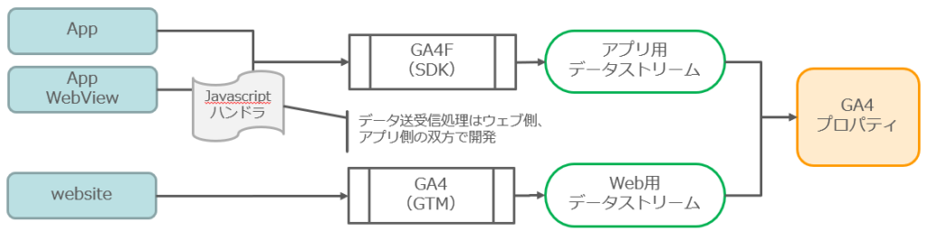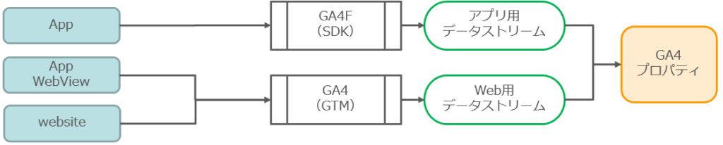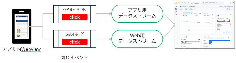 ネイティブアプリは「アプリ用データストリーム」、アプリ内Webviewは「ウェブ用データストリーム」を使います。GA4はデータストリームを跨いでセッションはつながりません。したがって、ネイティブアプリとアプリ内Webviewを行き来する行動のセッションは別々となります。