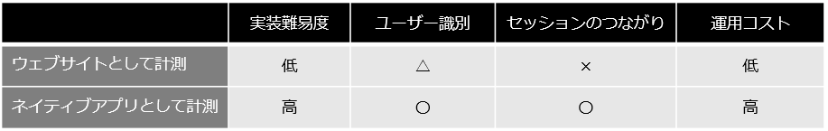 同一ユーザー/セッションで計測が必要であれば「ネイティブアプリとして計測」がよいでしょう。その場合、ある程度の技術力や技術理解が必要となります。