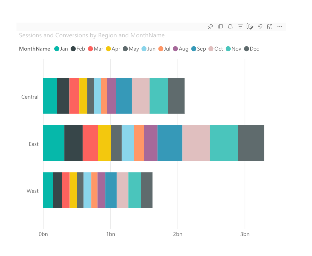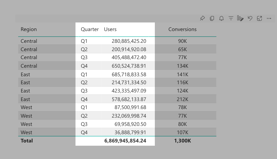 For example, instead of aggregating results by Month, they can switch to Quarter. And instead of analyzing Sessions count, they can compare Users against Conversions. Power BI lets end-users make these changes directly, without modifying the original report. This means the same table created by the report author can be personalized into a completely different view, such as the example below.