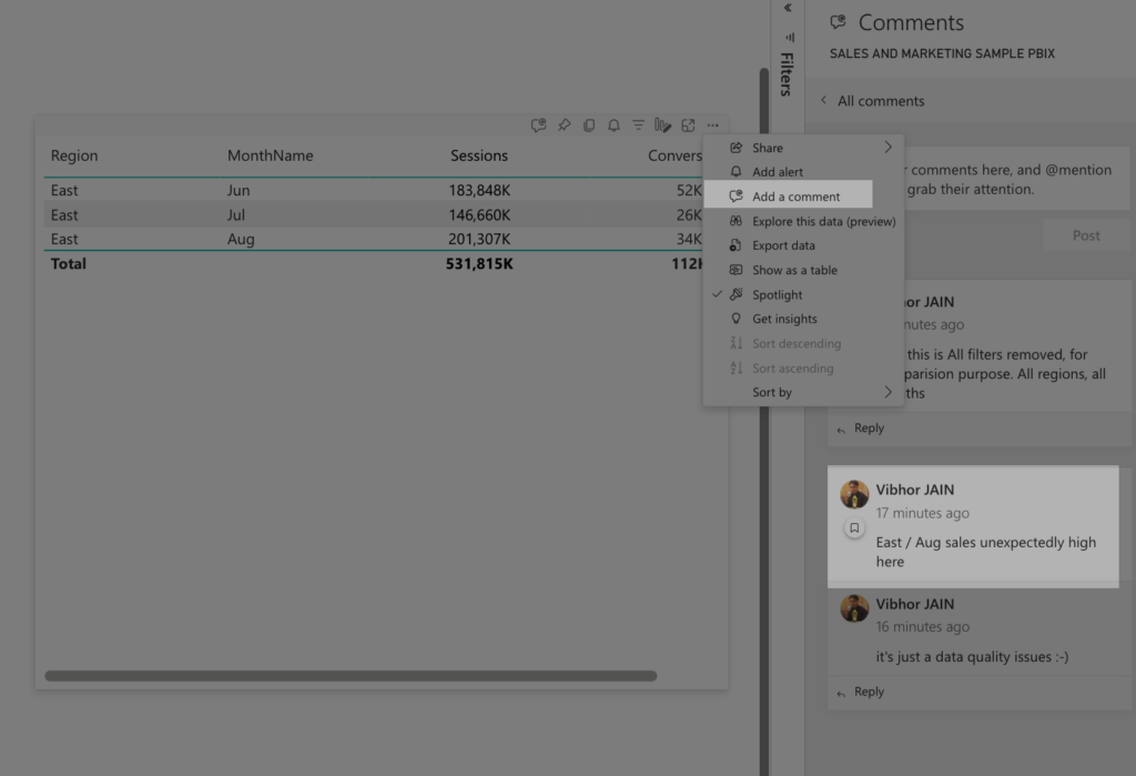 Power BI’s “Add comment” feature allows users to leave notes directly on a report page, or even a specific visual. These comments are threaded like a conversation and support @-mentions, letting users tag teammates and notify them instantly. Each comment also saves the exact filter and slicer state at the moment it was created, so anyone opening the comment later sees the data in the same context, preserving clarity and preventing misinterpretation.