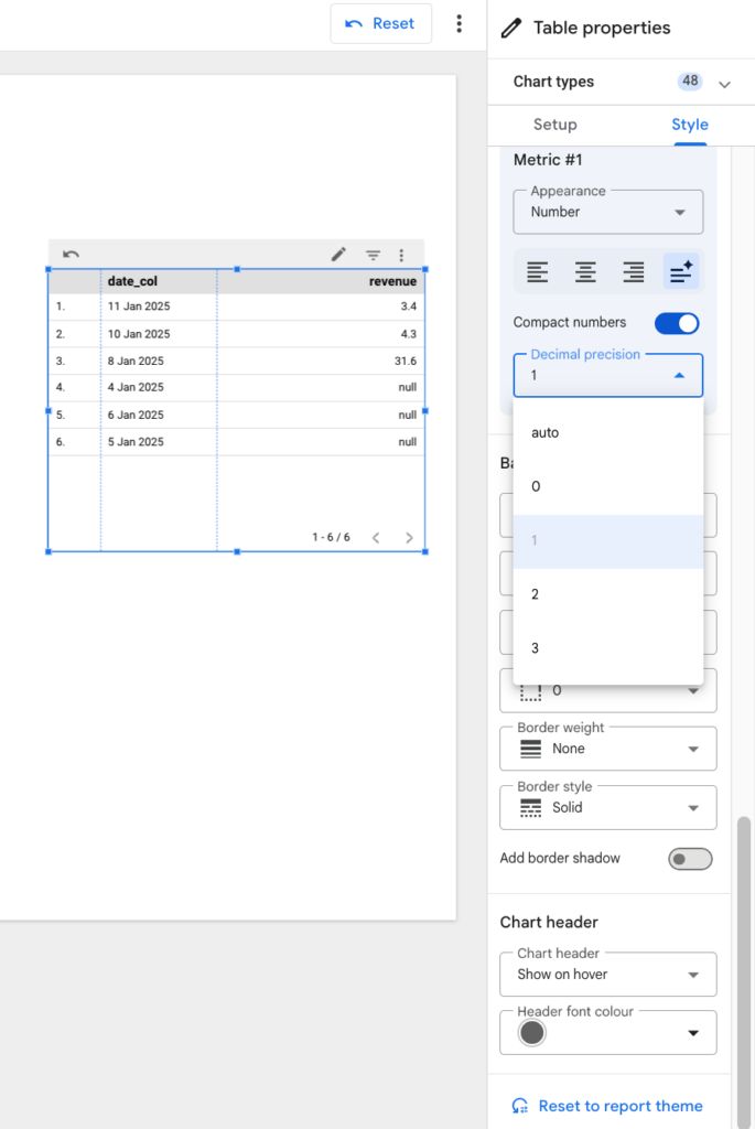 What’s most frustrating with Looker Studio, is after you do all this, if you change fields order within a chart (because business changes mind, and now would like to see Ad Spend column prior to revenue column!) all the formatting is gone! You have to redo (or at least re-check!) formatting for all the fields that have their ordering changed now.