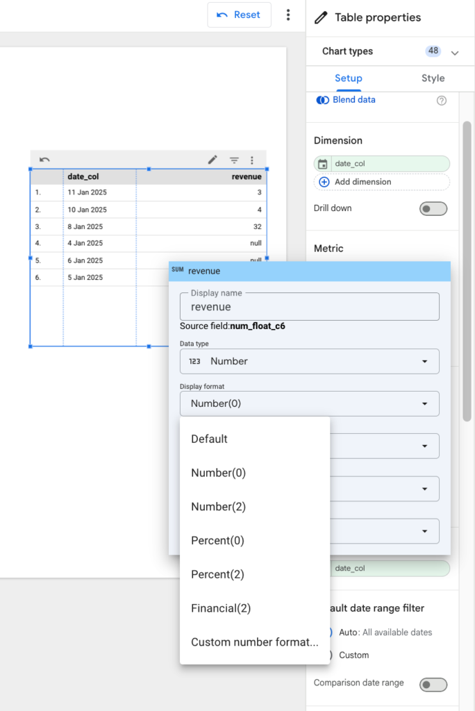 Looker Studio technically allows you to set these formats as well, but such display formatting is only at the individual chart level. If your report has 4 pages, each containing 3~4 tables or charts, and each visual includes 3~4 metric fields, you’re suddenly looking at 50 or more manual formatting steps. It’s repetitive, time-consuming, and increases the chance of inconsistency—especially in larger reports.