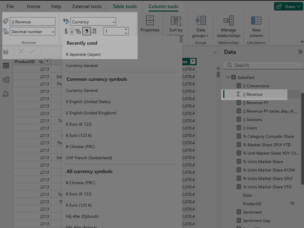 Compared to Looker Studio, this is much easier in Power BI by allowing authors to define formatting at the field-level—for both dimensions and metrics. Once formatting is set for each field, every visual using that field automatically inherits the same display rules. For example, you can configure a Date field to show as “Wednesday, 22 June 2005,” and set Revenue to display in with relevant Currency symbol ¥ (Japanese Yen) with 1 decimal precision
