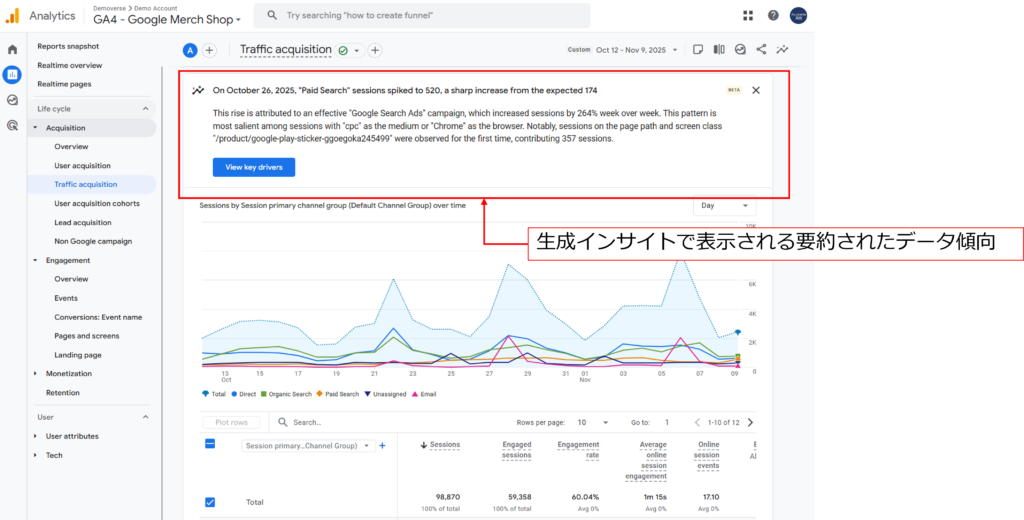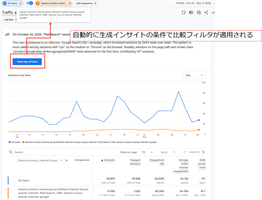 このように、詳細レポートを表示するだけで、選択した期間中に発生した大きな変化を文章で素早く理解することができます。また、生成インサイト内にある「View key drivers」を選択すると、その条件が自動的に比較フィルタに反映され、レポートに適用されます。