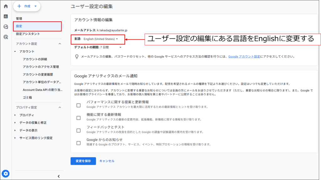 方法1:GA4管理画面のユーザー設定から英語にする方法
