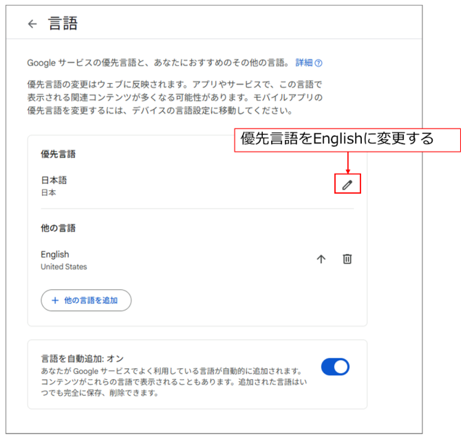 Googleアカウントの管理画面から「個人情報>ウェブ向けの全般設定」にある言語をEnglishに変更します。