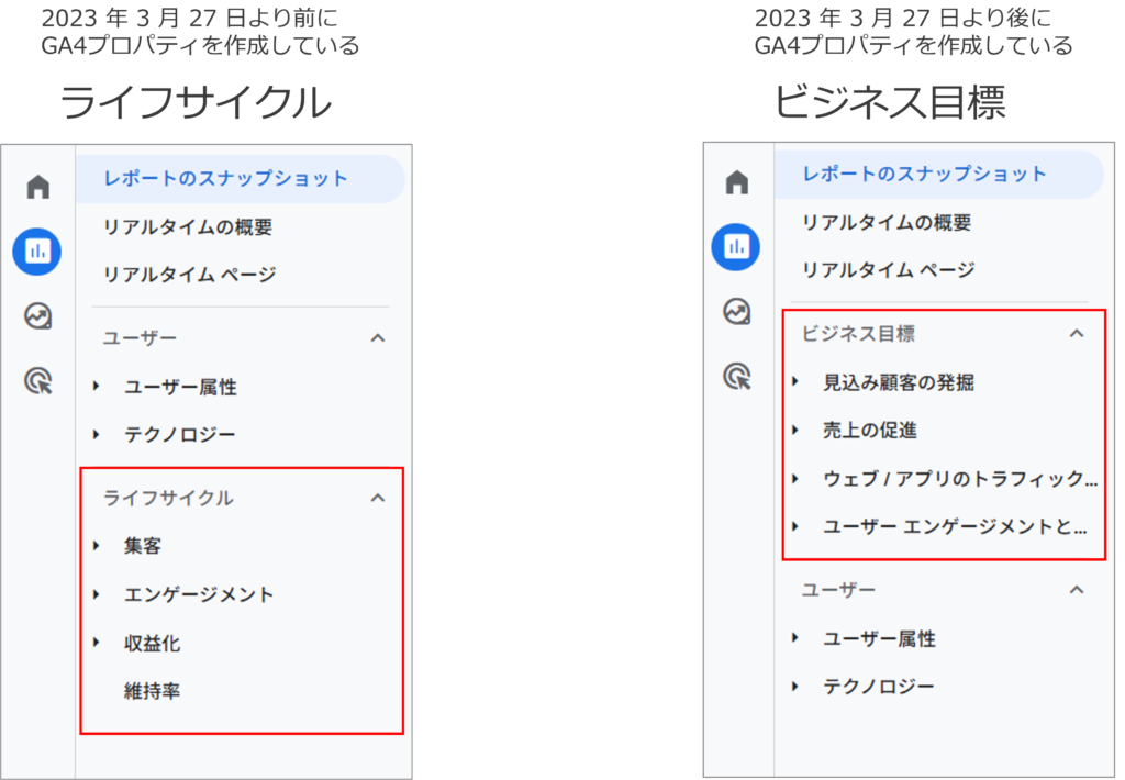 ![[GA4]デフォルトコレクション(メニュー)の違い:「ライフサイクル」と「ビジネス目標」](https://ayudante.jp/wp-content/uploads/2025/10/GA4.png)