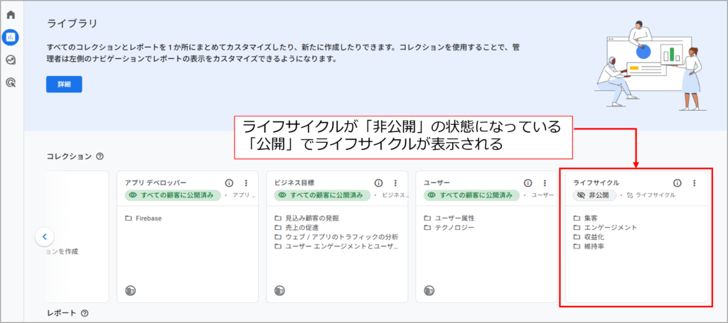 「ライブラリ機能」はGA4の権限で「編集者・管理者」が利用できる機能ですので、「ライフサイクル」コレクションを表示させる場合は、GA4の担当者に相談しましょう。