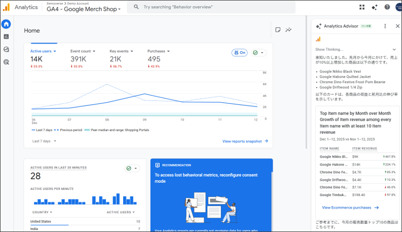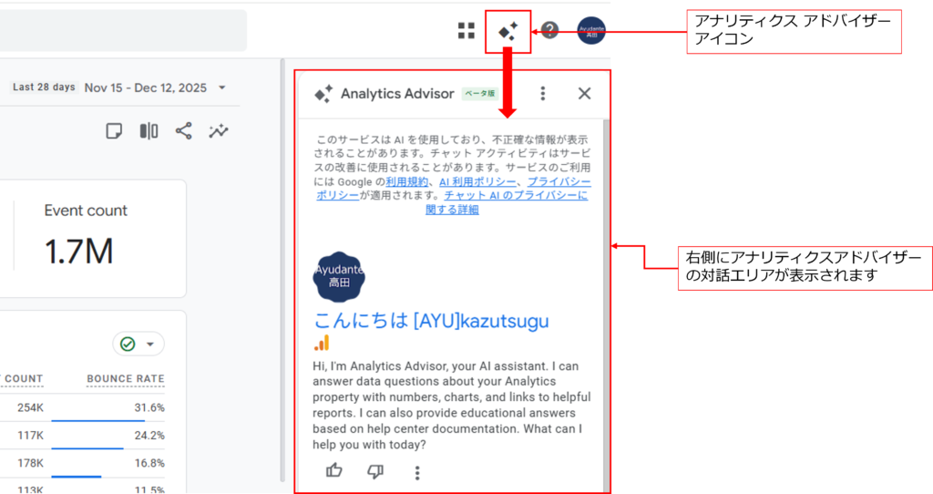 2025年11月ごろにβ版として提供が開始され、当初はGA4の選択言語が英語のプロパティでのみ利用可能だった「アナリティクス アドバイザー」ですが、現在では選択言語が英語であれば、チャット機能において日本語での質問・回答にも対応しています。
