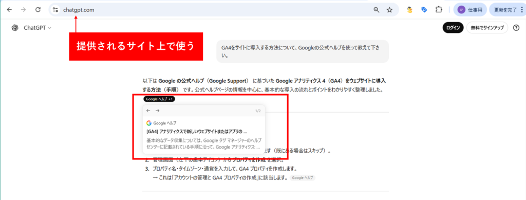 挙動としては先に書いた「サイトを訪れて会話するチャット形式のAI」と同じですが、チャットするページのURLが「https://www.google.com/search?・・・」や「https://search.yahoo.co.jp/chat?・・・」のように、検索エンジンのドメインであるという点がGA4の観点から重要になります。