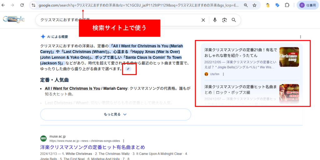 こちらは検索結果の上部に表示するだけで独立したページではないので、もちろんURLも検索結果画面と同じもの、Googleなら「https://www.google.com/search?・・・」になります。