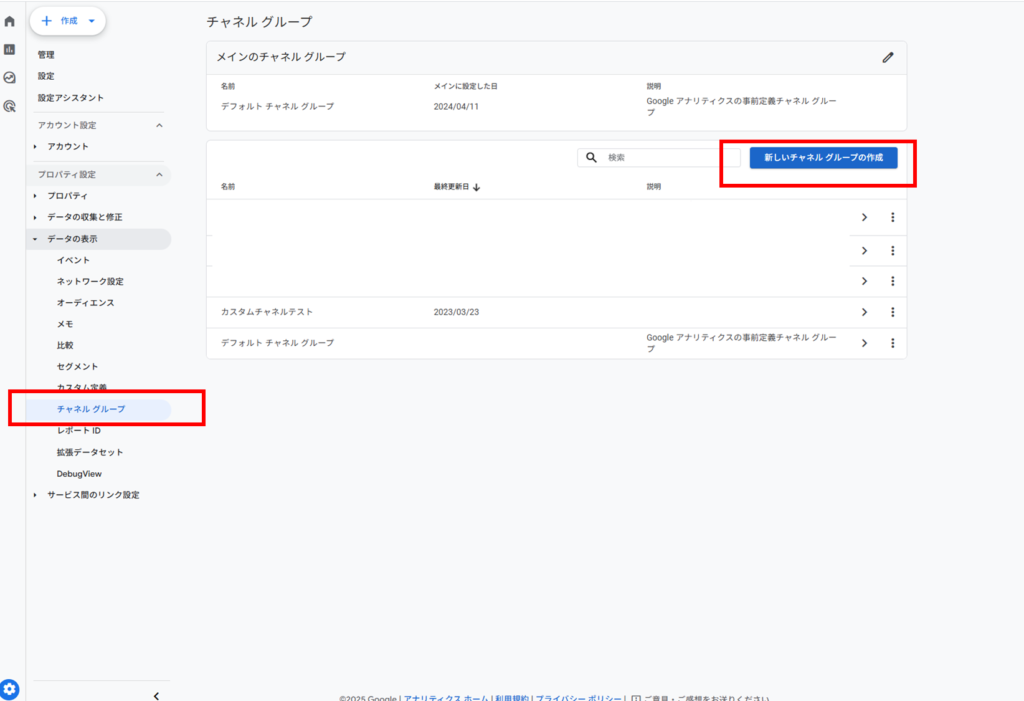 管理画面の「プロパティ設定」内「データの表示」の中にある「チャネルグループ」を表示し、「新しいチャネルグループの作成」を選択します。