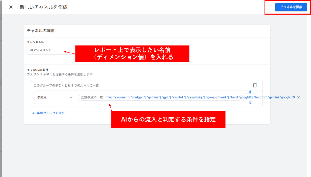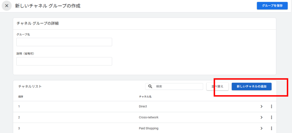 カスタムチャネルグループを作成するには編集者以上の権限が必要です。作成したチャネルグループはプロパティを利用できるすべての人がレポート上で利用できるようになります。