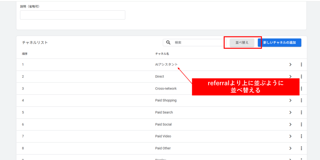 なので、もともと分類されていた「referral」が作ったチャネルより上位にあると「referral」に含まれてしまいます。必ず先程作ったチャネルの方が上に来るように並べ替えましょう。