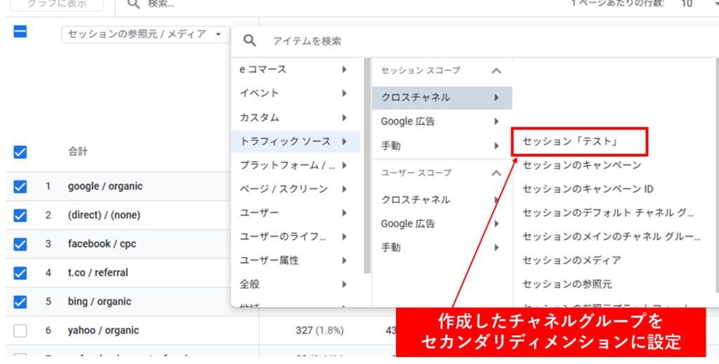 候補から選択する場合は「トラフィックソース」の中のセッションスコープの「クロスチャネル」の中から先ほどのチャネルグループを選びます。
