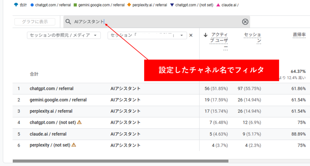 では特定できる「サイトを訪れて会話するチャット形式のAI」をレポート上で他の参照元と切り分けて表示する方法を説明します。