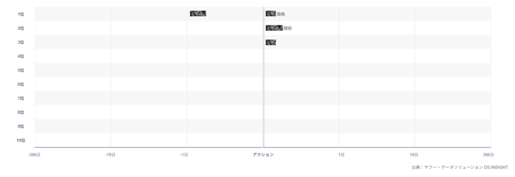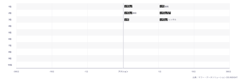 このターゲティングでは、広告接触前に自ブランドを検索しているユーザーは確認できませんでした。一方で、広告接触後には、ブランド名の検索に至り、さらに「値段」「レンタル」といった具体的な行動を想起させる検索も見られました。