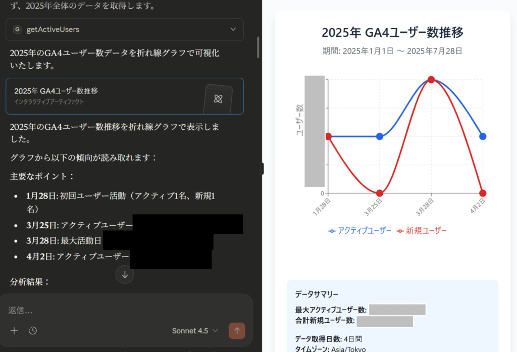 Gemini以外の生成AI、たとえばClaudeやCursor、コードを生成するGemini CLIなどMCPサーバーに対応したAIエージェントが使えます。分析結果からグラフを作製したり、レポートページを生成することもできます(連係する生成AIの機能による)。